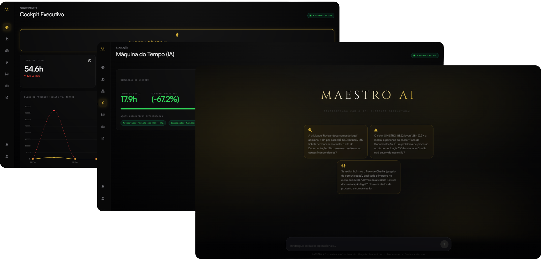 Converse com a sua empresa. Faça perguntas em linguagem natural e receba diagnósticos precisos. Nossa IA mapeia cada fluxo de trabalho, eliminando falhas de handoff e tornando a ineficiência impossível de se esconder.